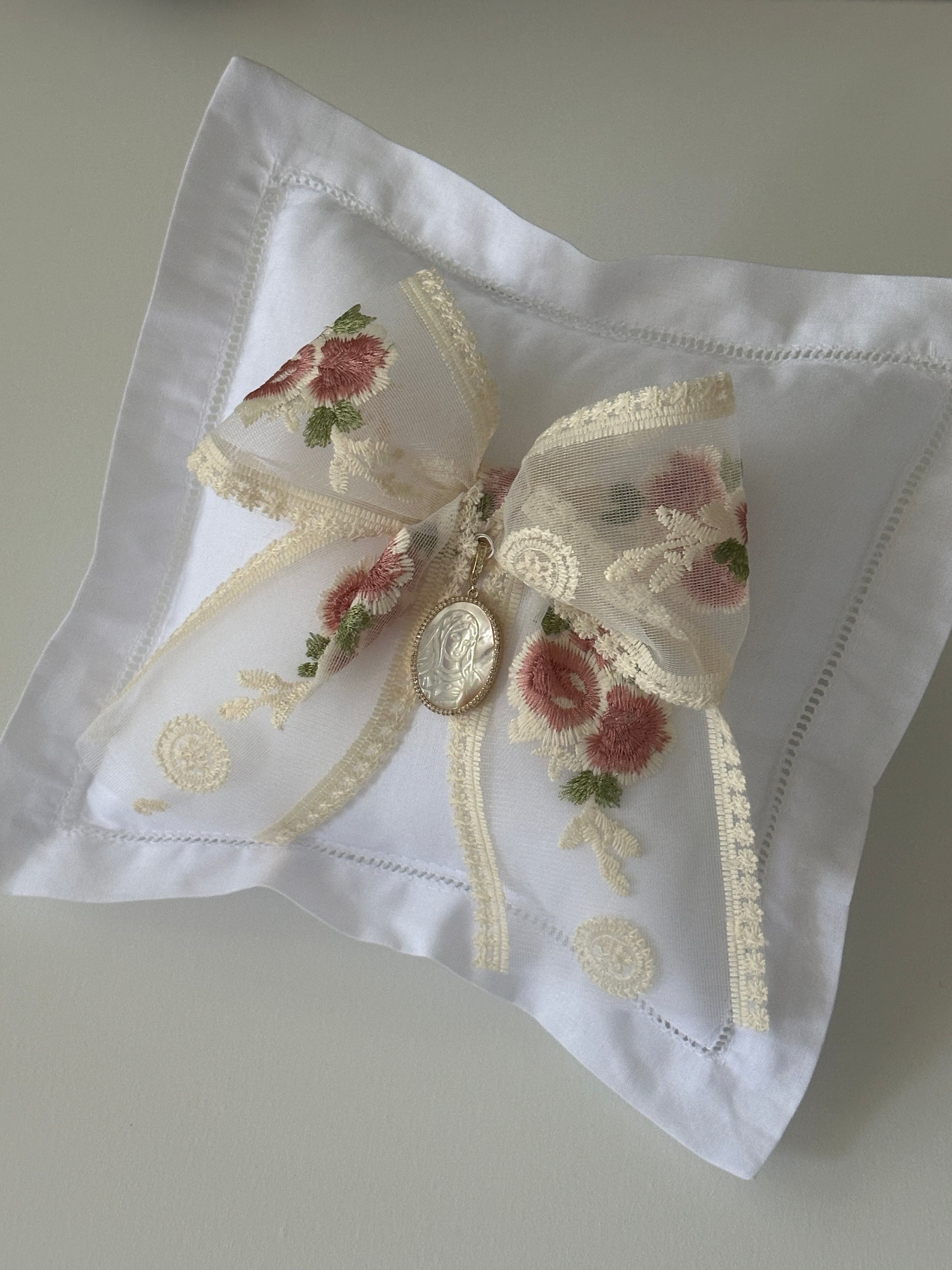 Tulip Pattern Bow and Mother Mary Charm Baby Pillow