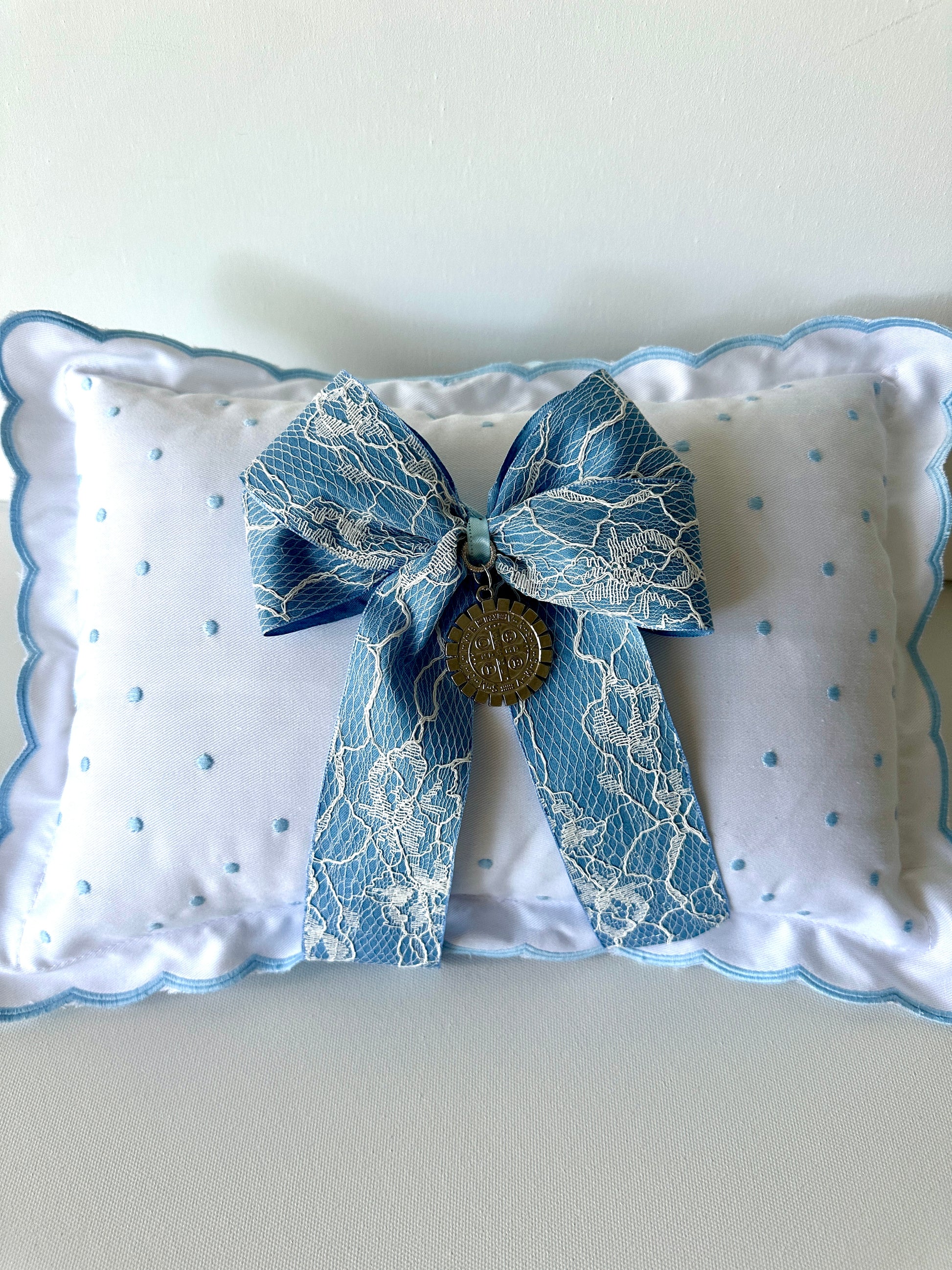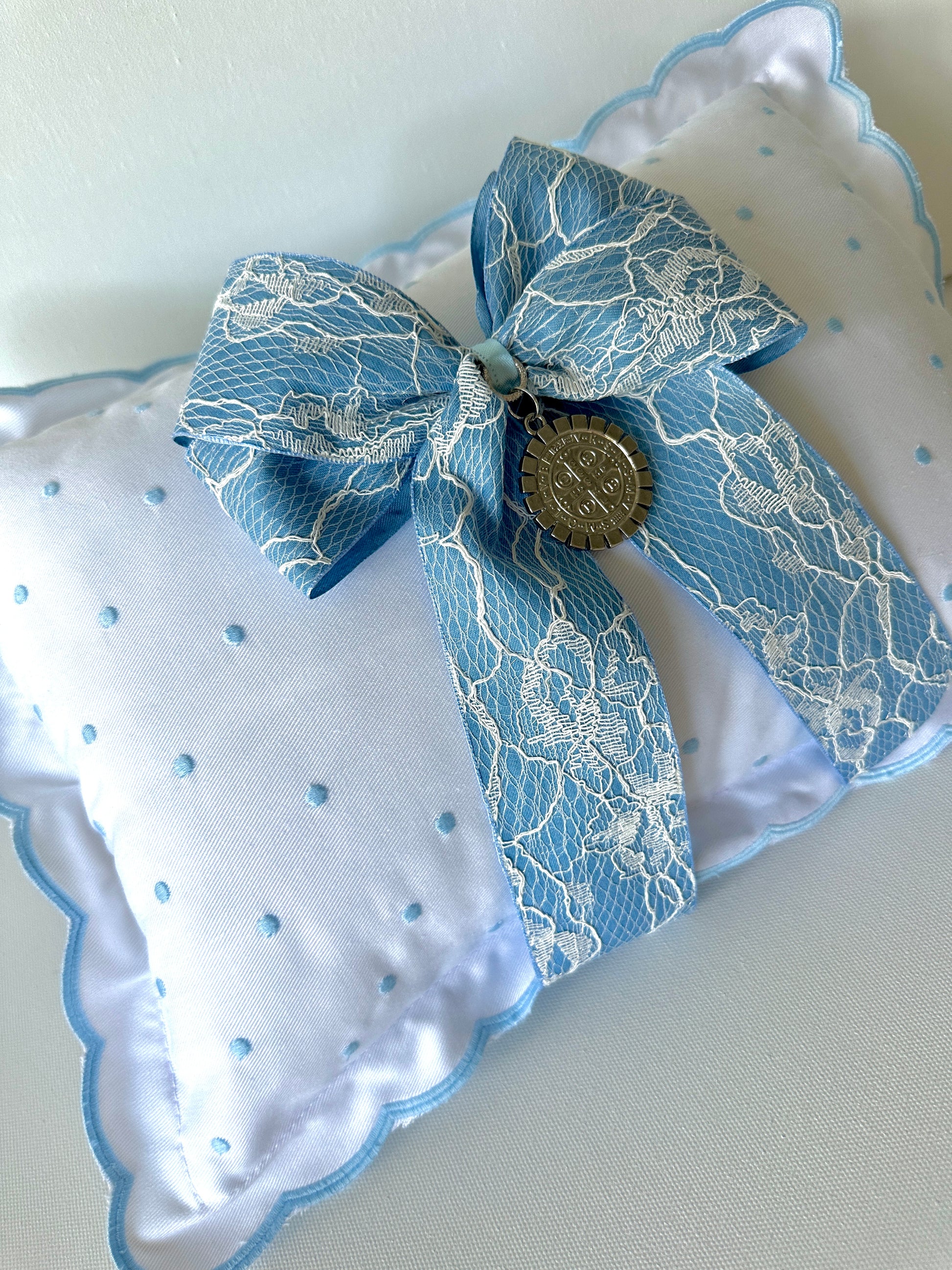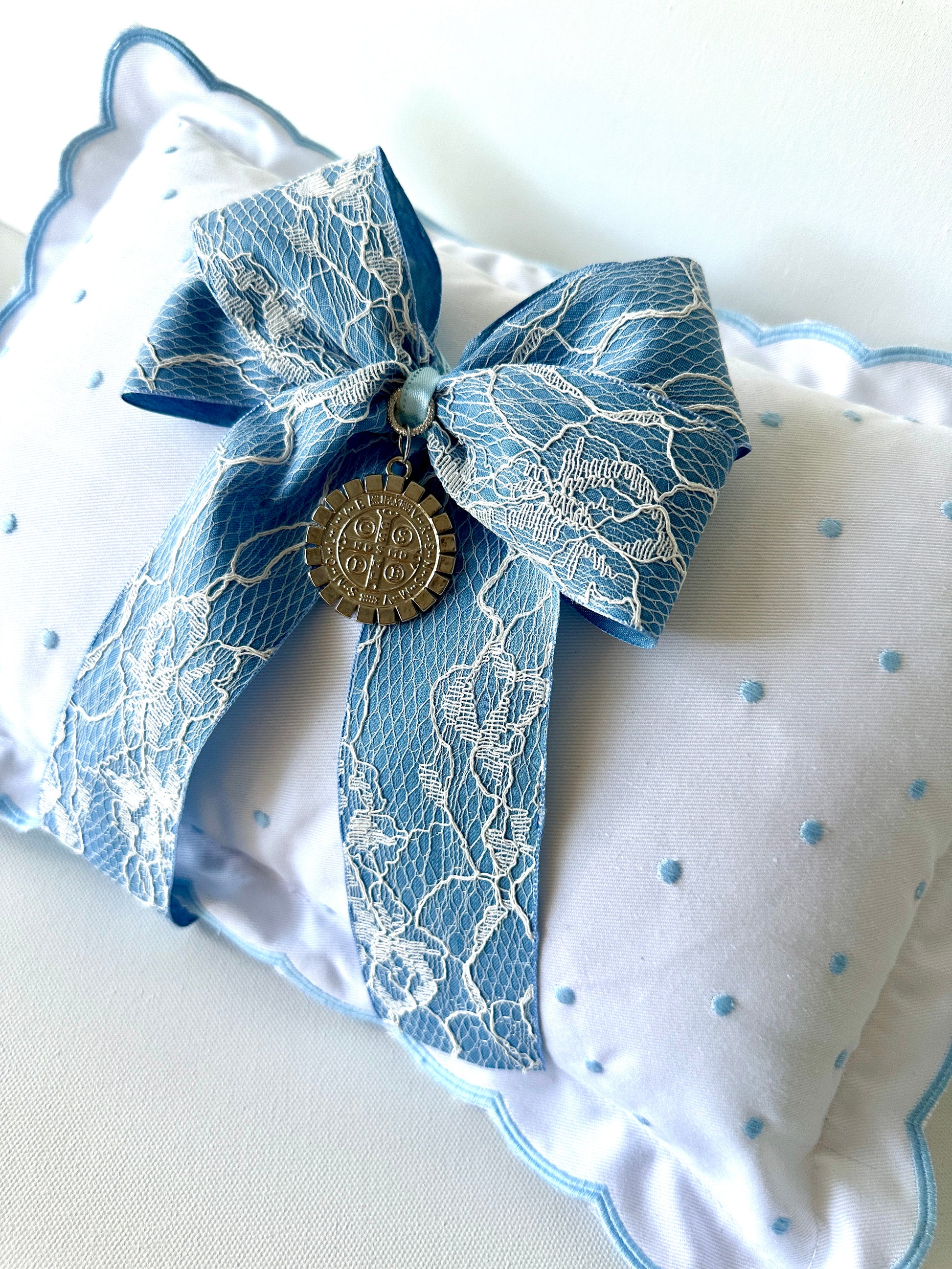 Introducing the Baby Pillow San Benito Silver pillow blue ribbon and lace accent, featuring a silver medallion of San Benito Abad. Crafted with soft and delicate materials, this pillow provides comfort and elegance for your little one. Perfect for nurseries and cribs, it's a charming addition to any baby's bedding.