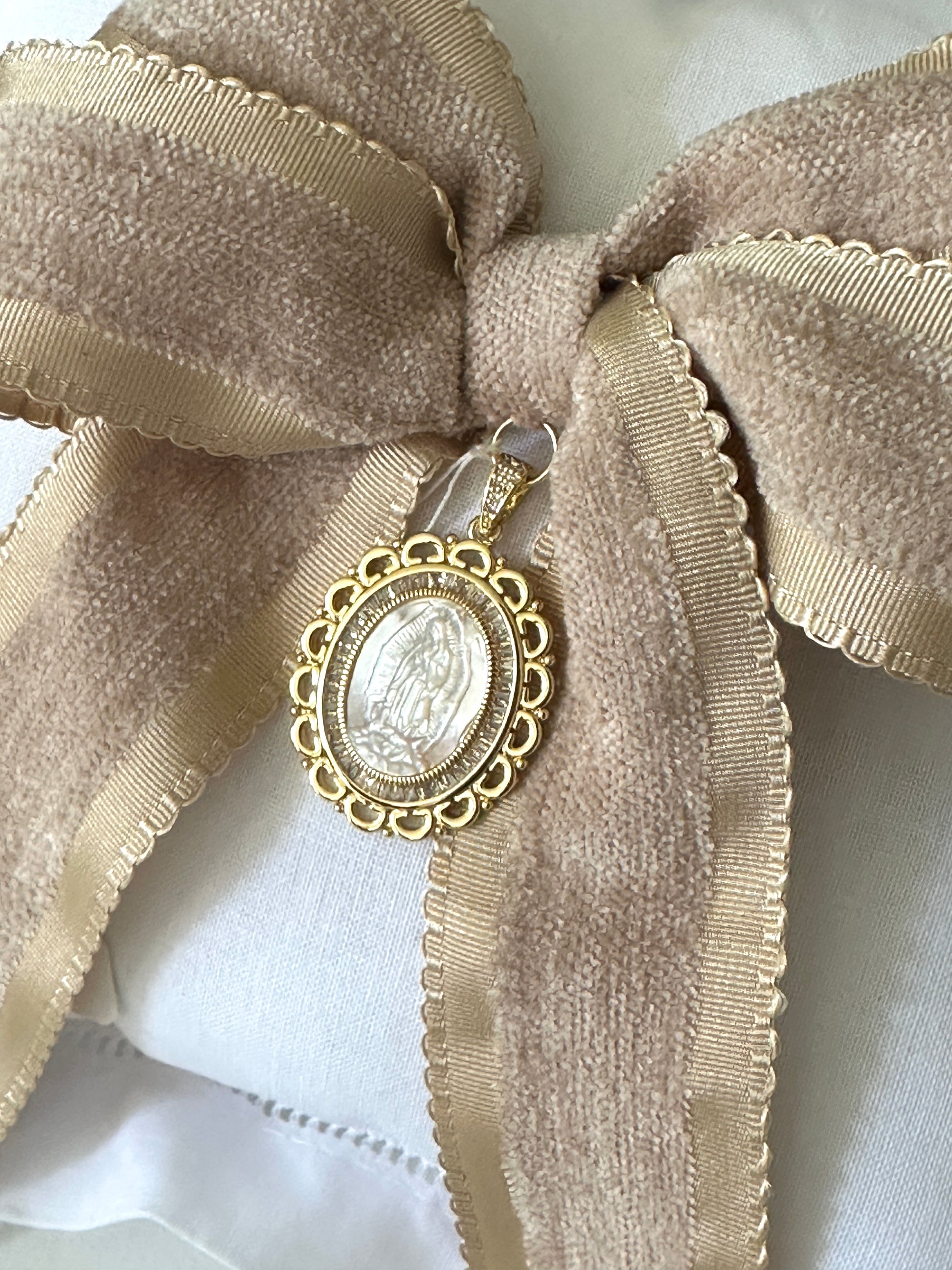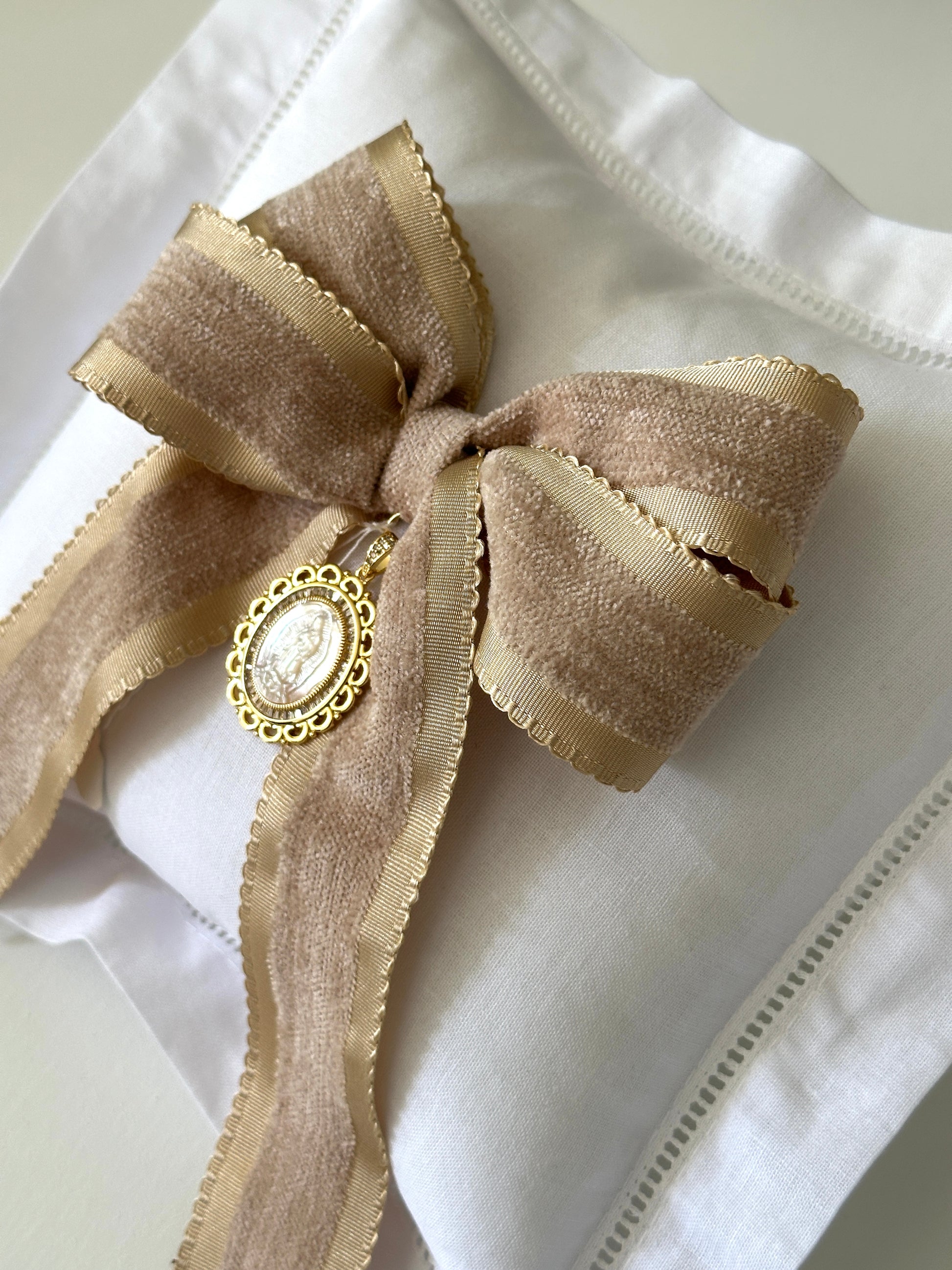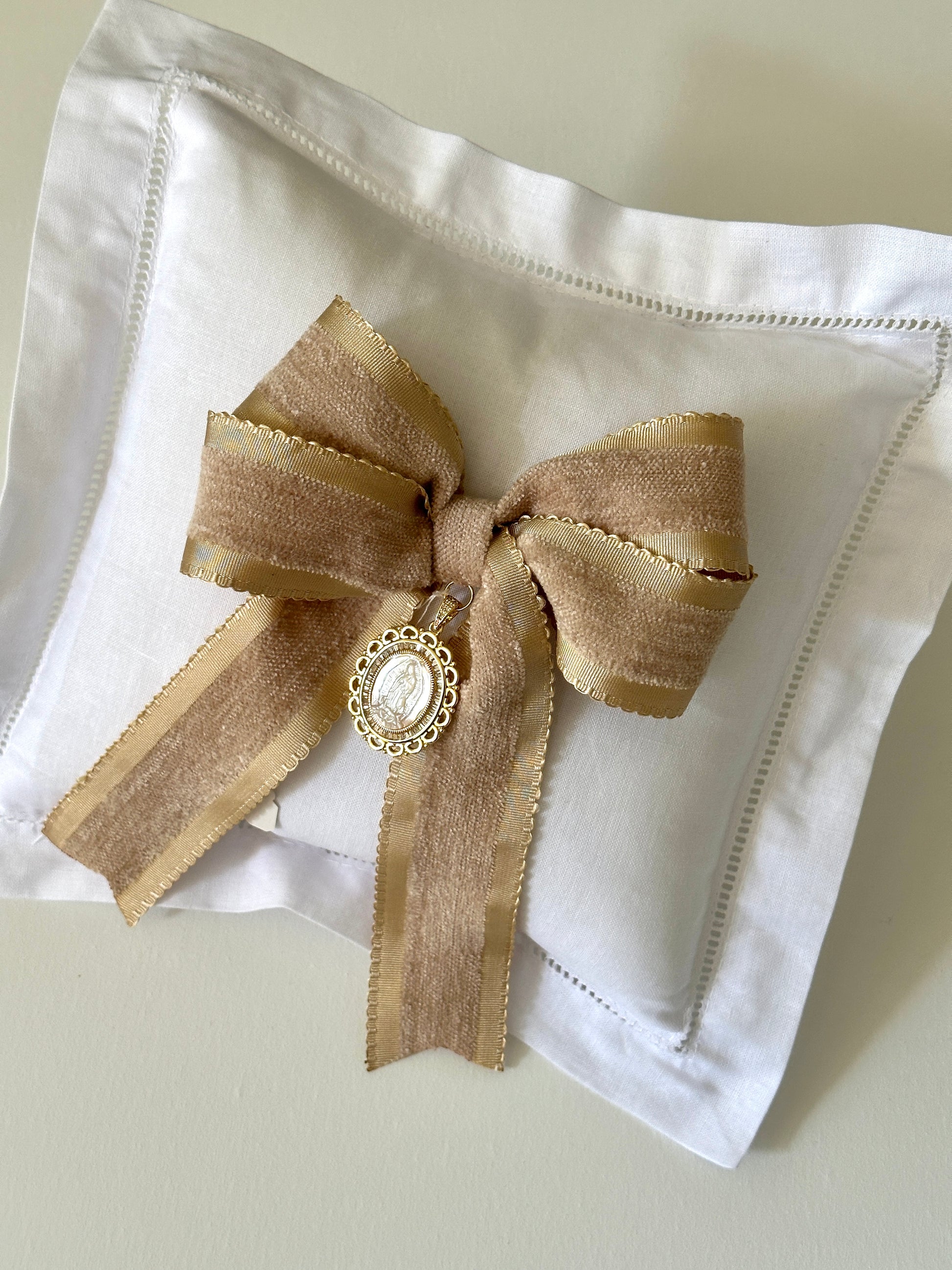 This square linen pillow features a satin ribbon bow and beige velvet trim. Adorned with a gold mother-of-pearl and zirconia medal of the Virgin of Guadalupe. Enhance your home decor with this elegant piece.