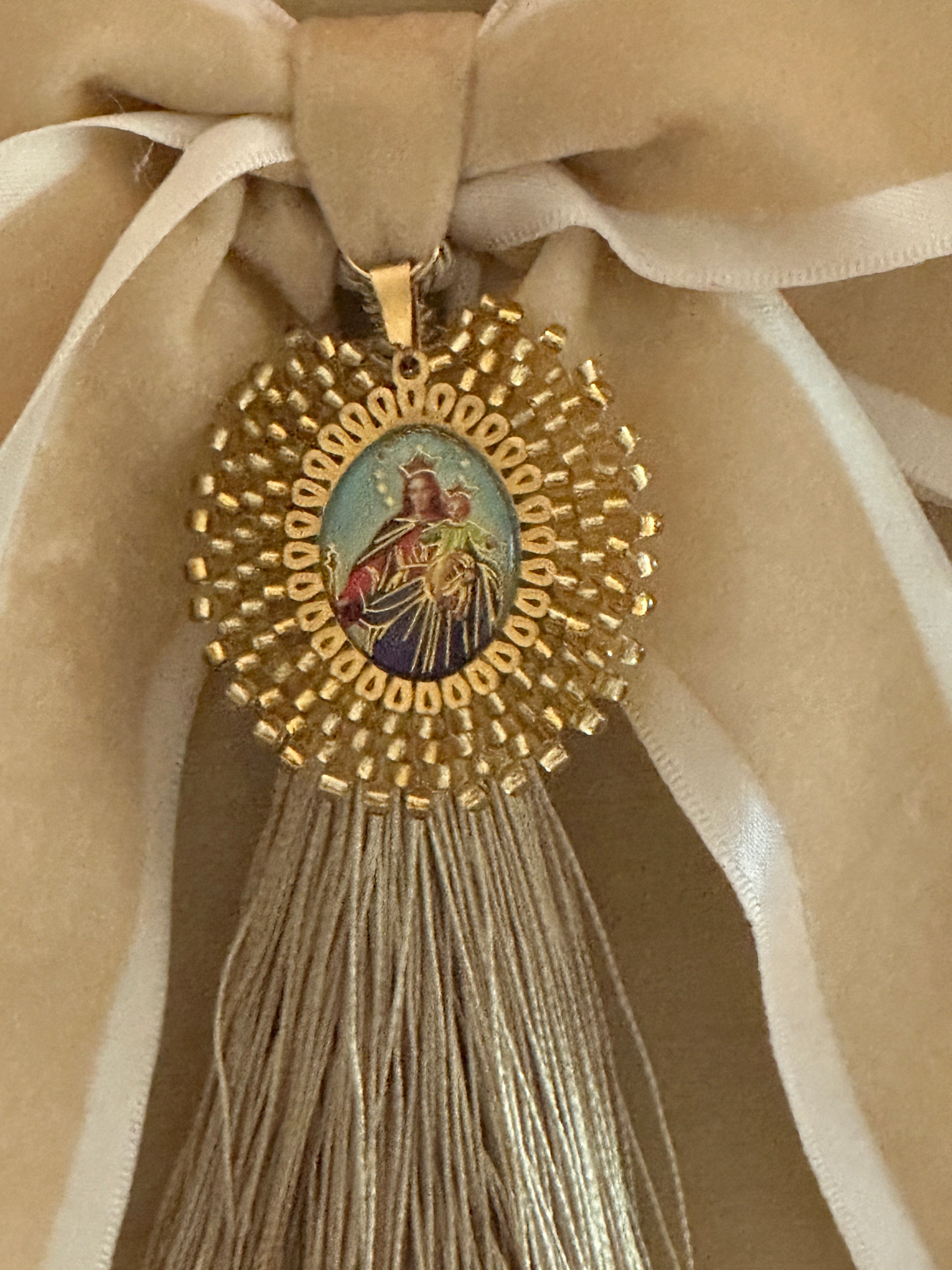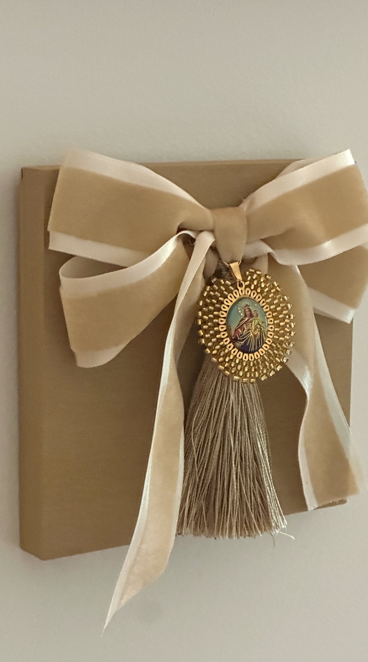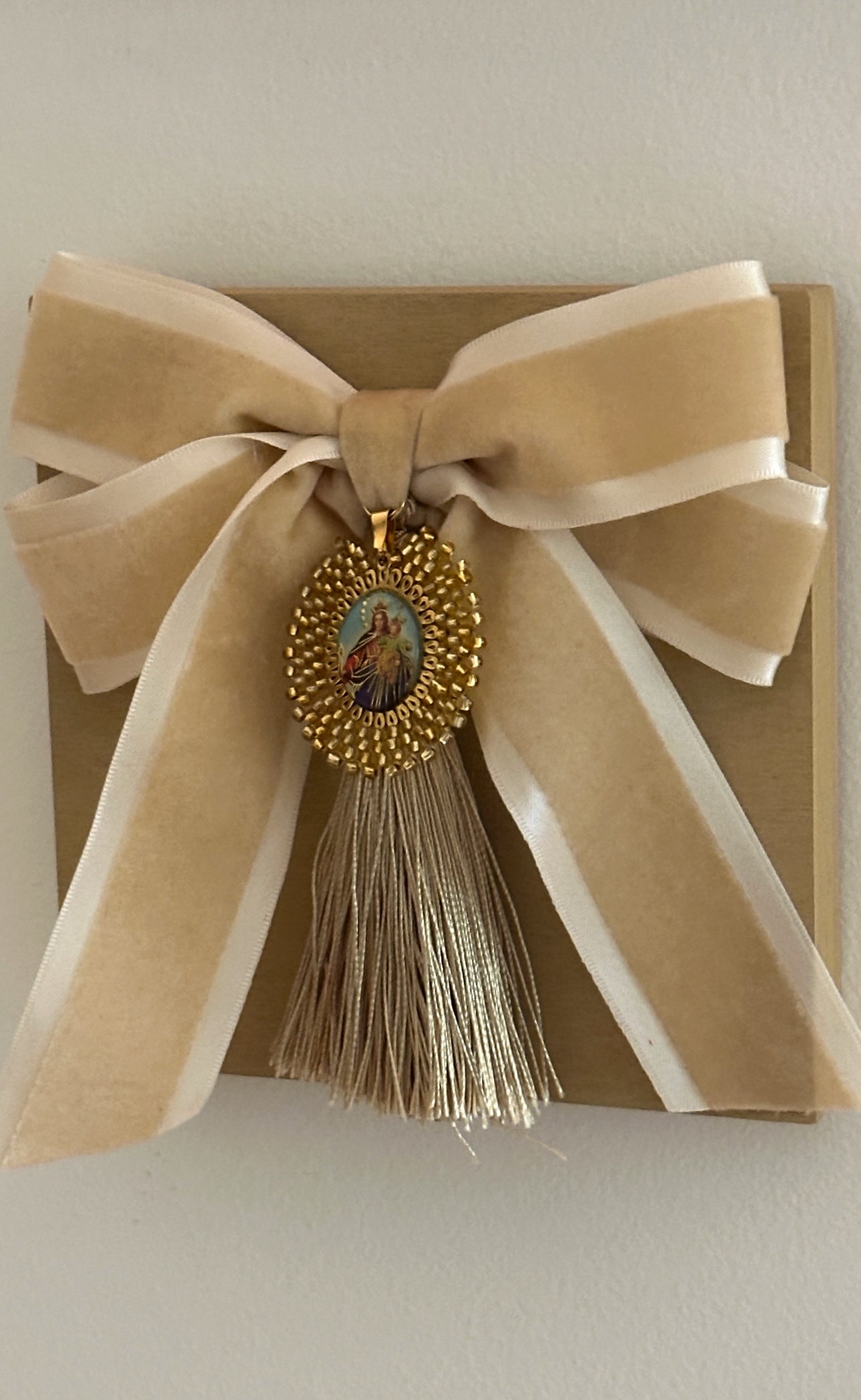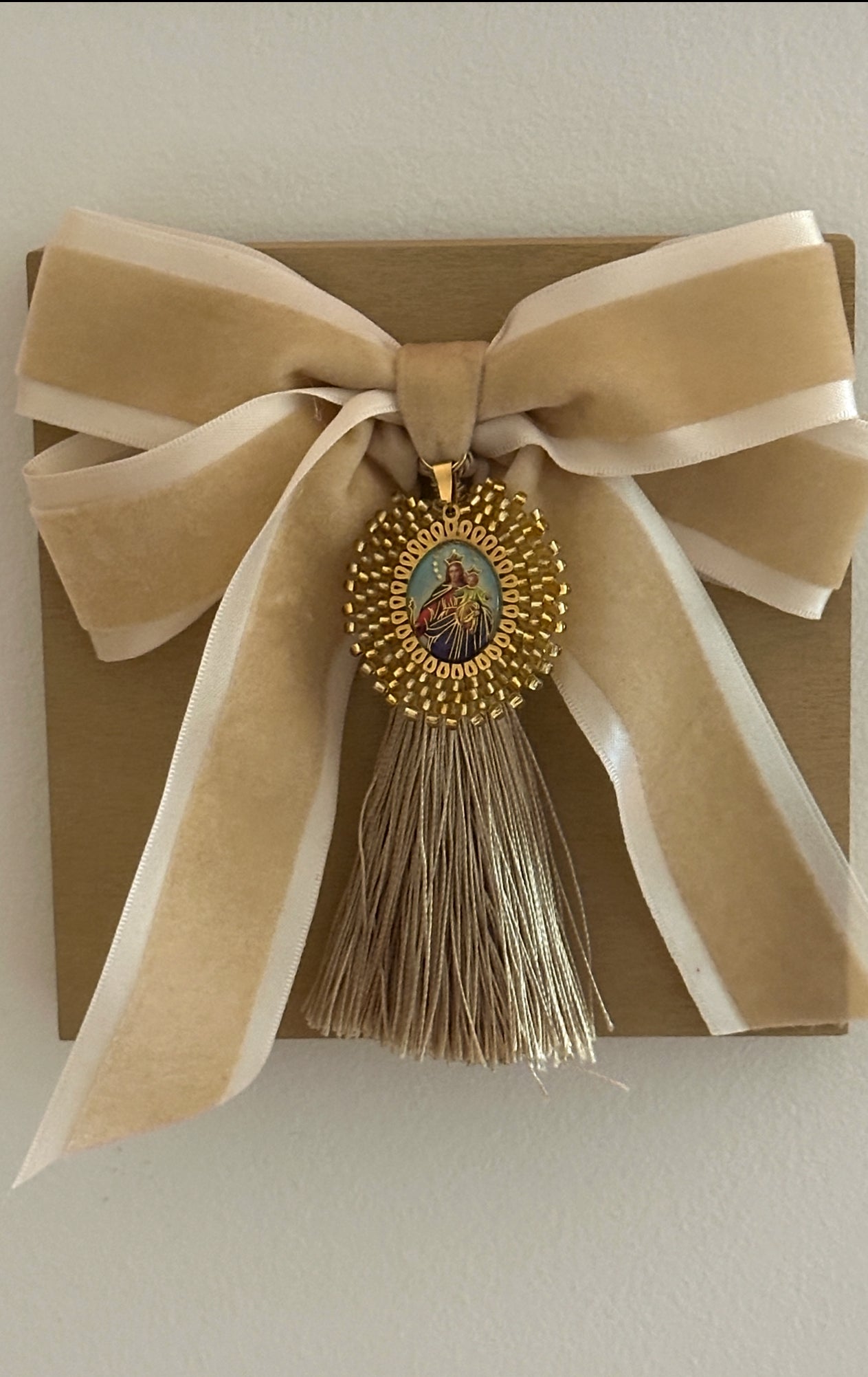 Handcrafted wooden base box decorated with velvet and beige satin ribbon bow, featuring a delicate medallion of the Virgin of Carmen, adorned with pucas. Add a touch of elegance to any room with this unique cuadrito.