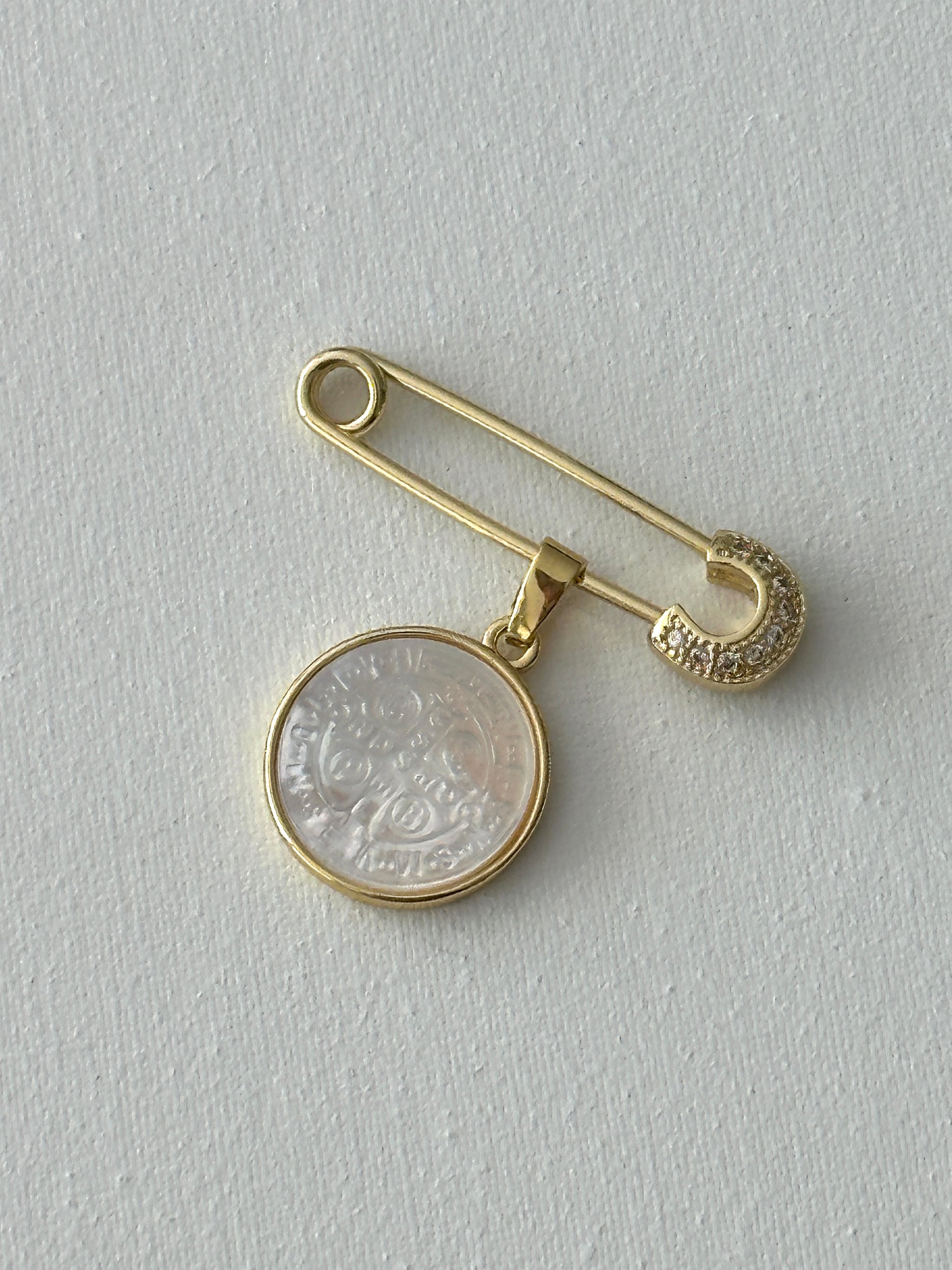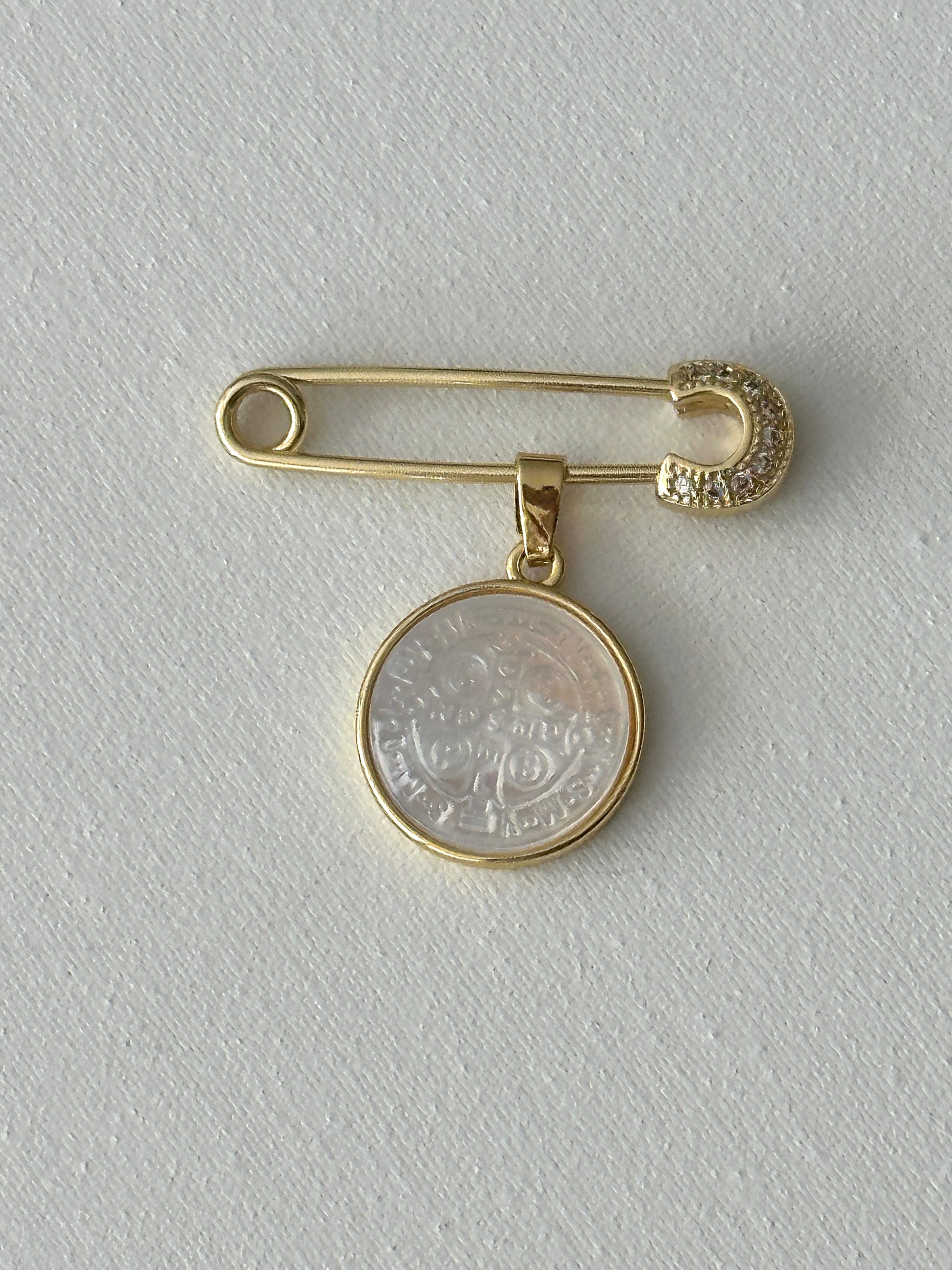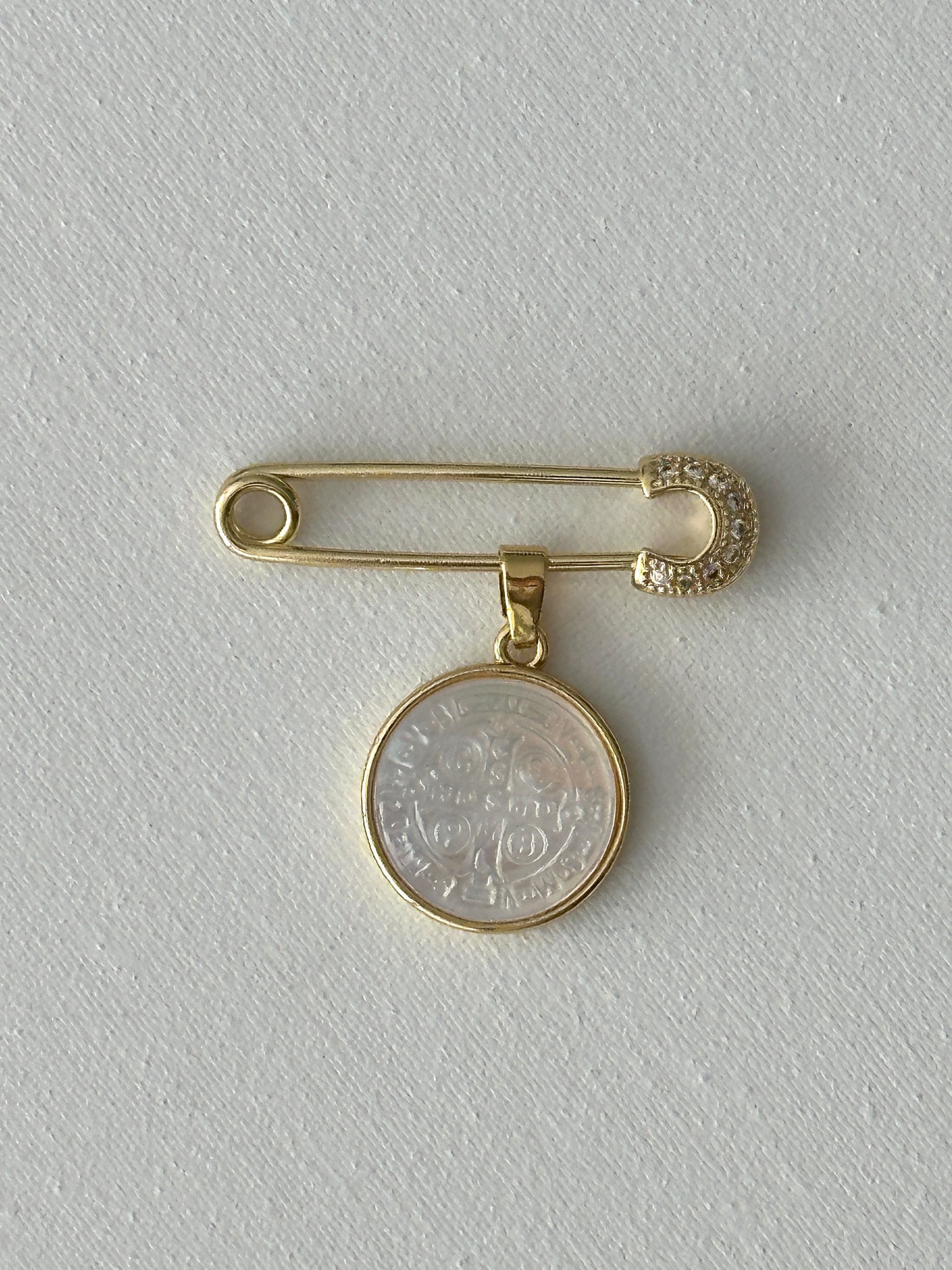 Discover the power of the Imperdible Cruz San Benito Abad. This model features an Alpita screw tip with a nacre medal and a golden border of the San Benito Abad Cross. Experience the elegance and protection this imperdible offers.