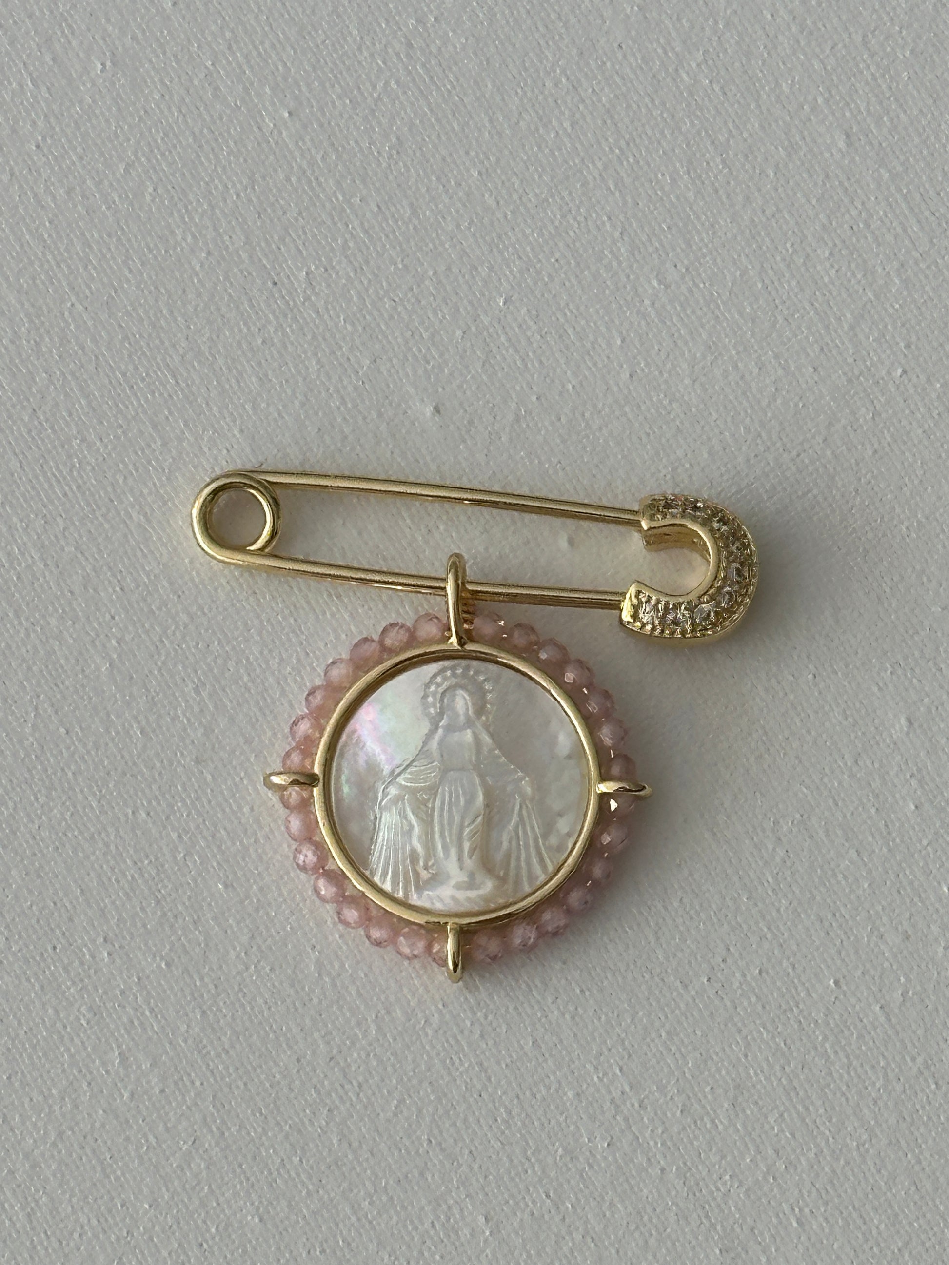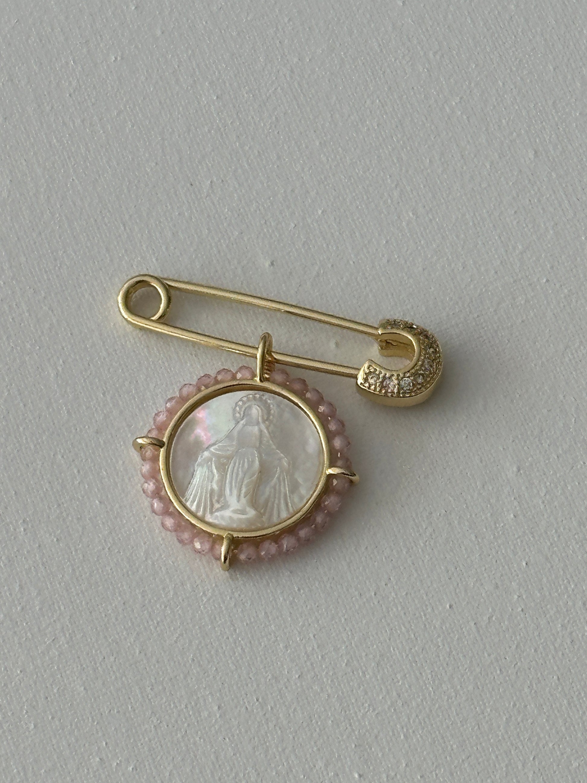 Discover the breathtaking beauty and divine symbolism of the Imperdible Rose Milagrosa. Featuring an Alpita zirconia tip with a delicate mother of pearl medallion, accentuated by stunning pink stones representing the miraculous Virgin Mary. Perfect for adding a touch of elegance and faith to any outfit.