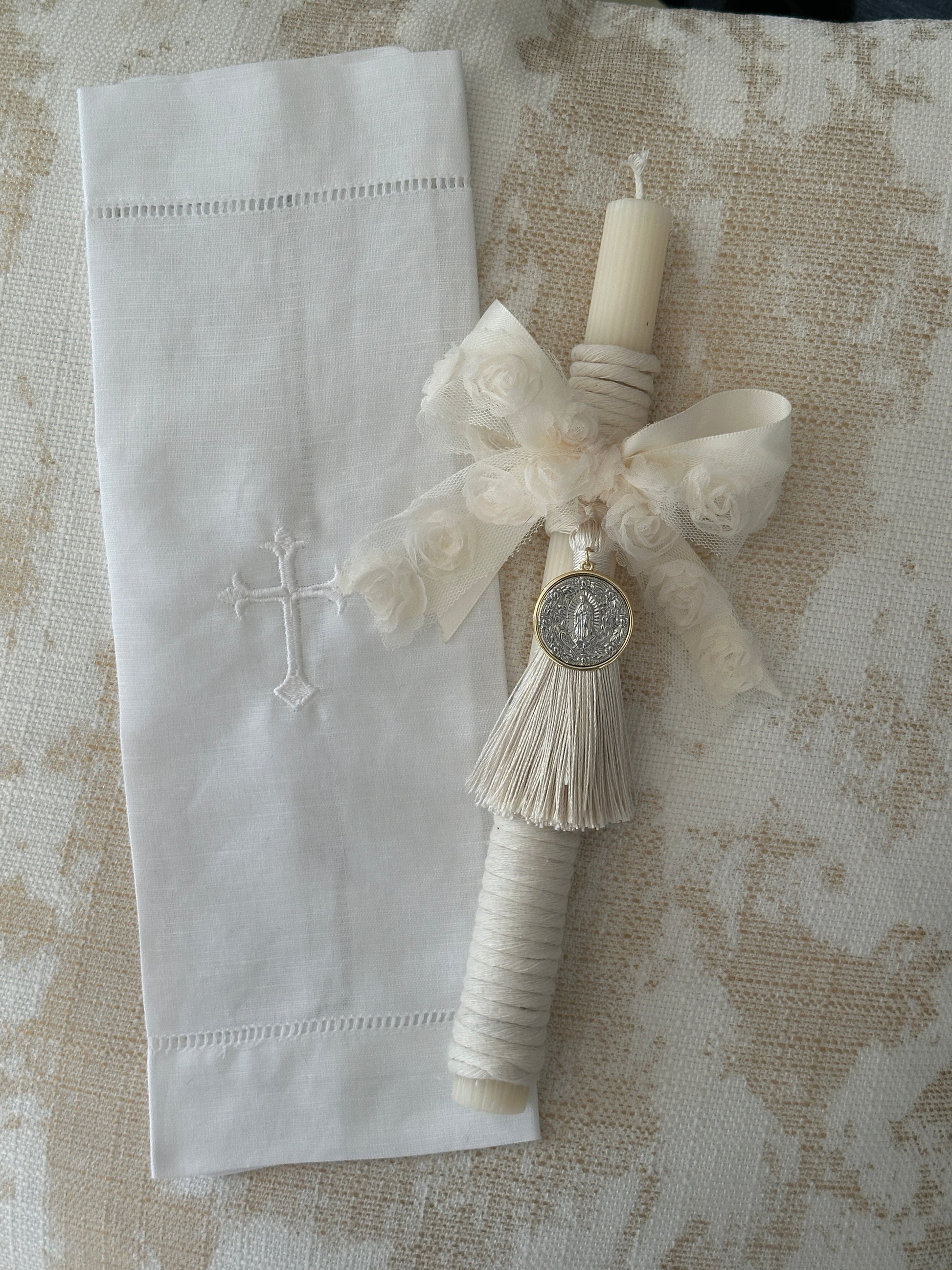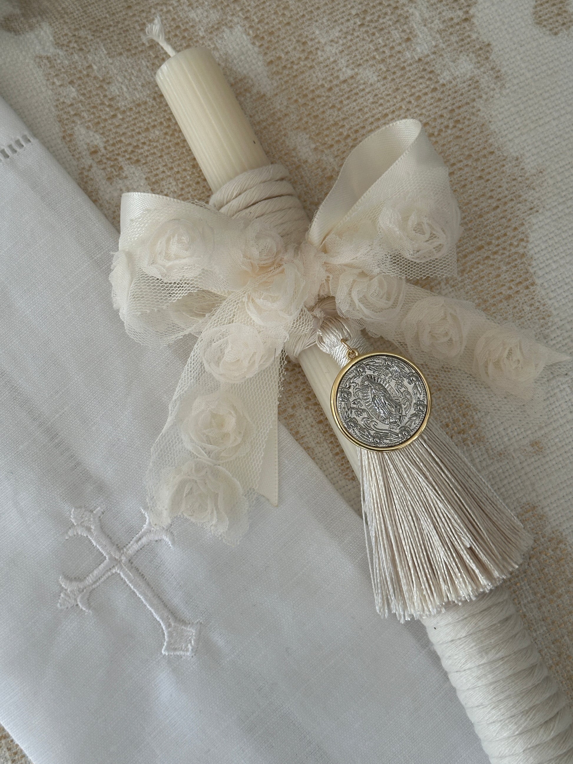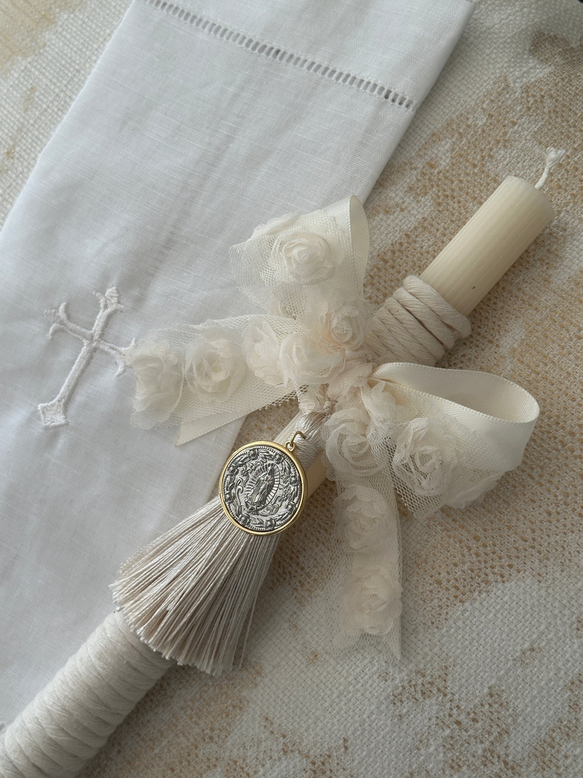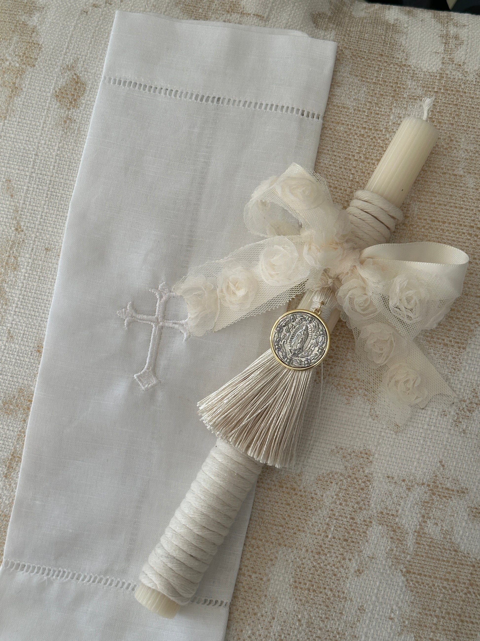 Introducing our Baptism Kit - a beautifully decorated candle with ribbons, bow, and a silver medal of the Virgin of Guadalupe. Includes an embroidered cross handkerchief. Perfect for a special religious ceremony.