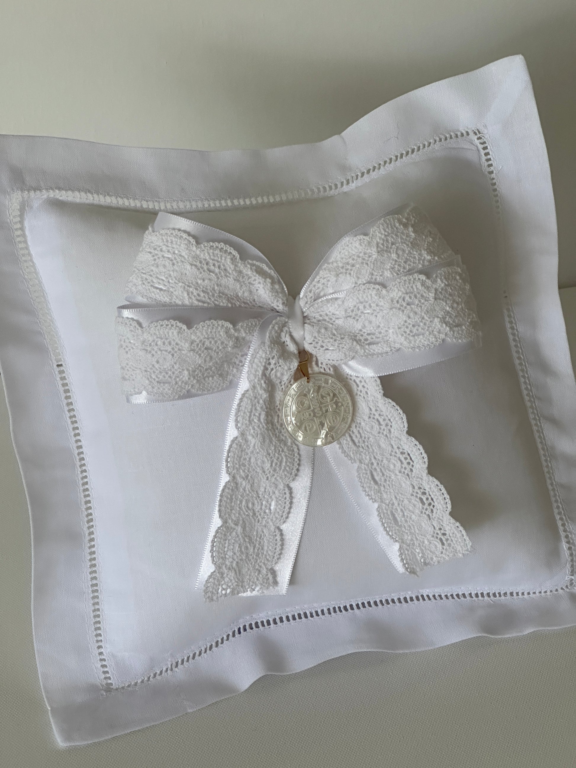 Enhance your home decor with our Lace White Cruz San Benito Abad Almohada/Cojin. Featuring a double ribbon, delicate lace, and a nacre San Benito Abad cross, this square pillow brings a touch of elegance to any room. Add comfort and style to your space with this unique and beautifully crafted piece.
