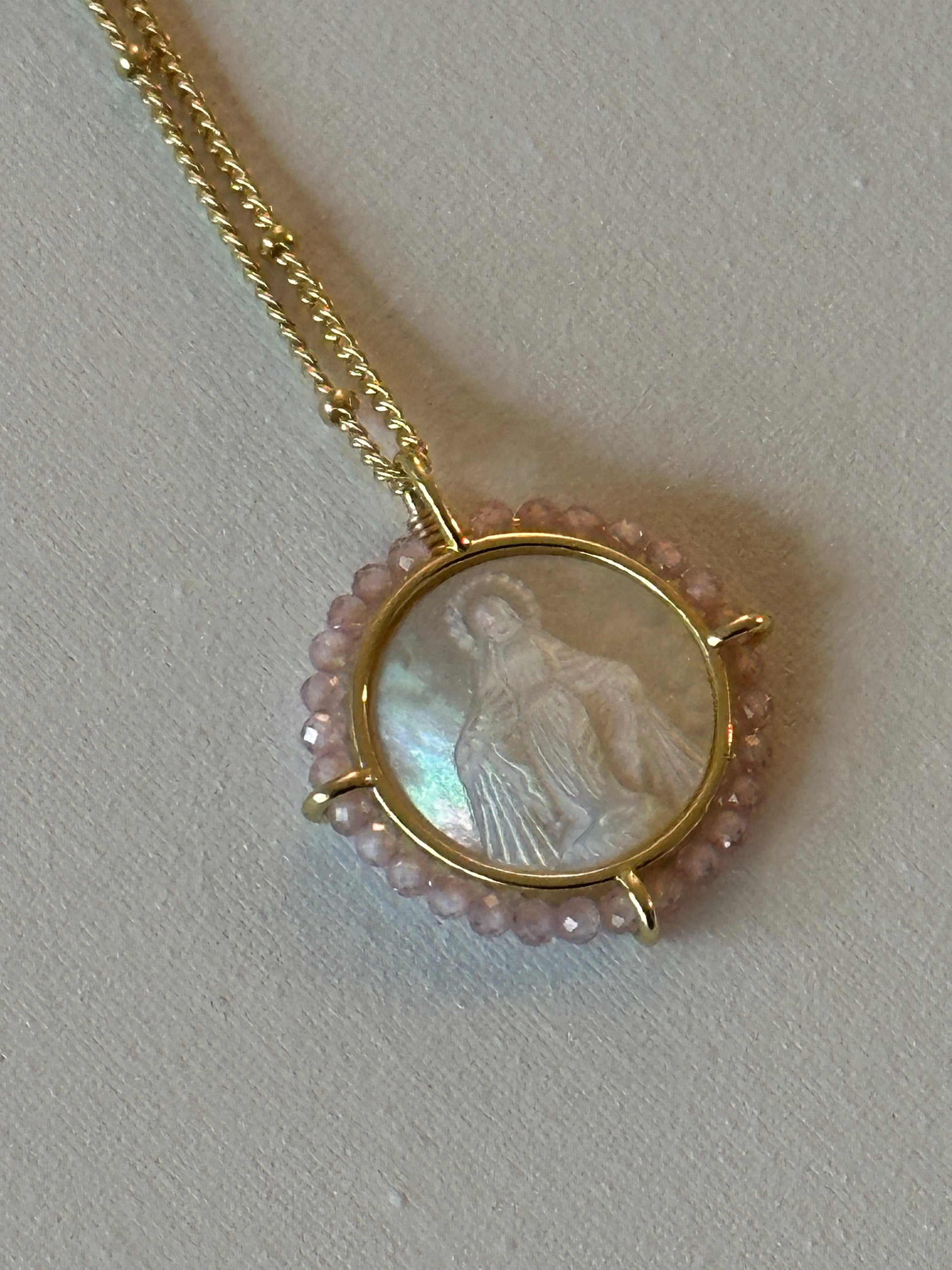 This necklace features a milagrosa mother-of-pearl pendant with a border of pink stones. Add a touch of elegance and faith to your look with Nácar and rose.