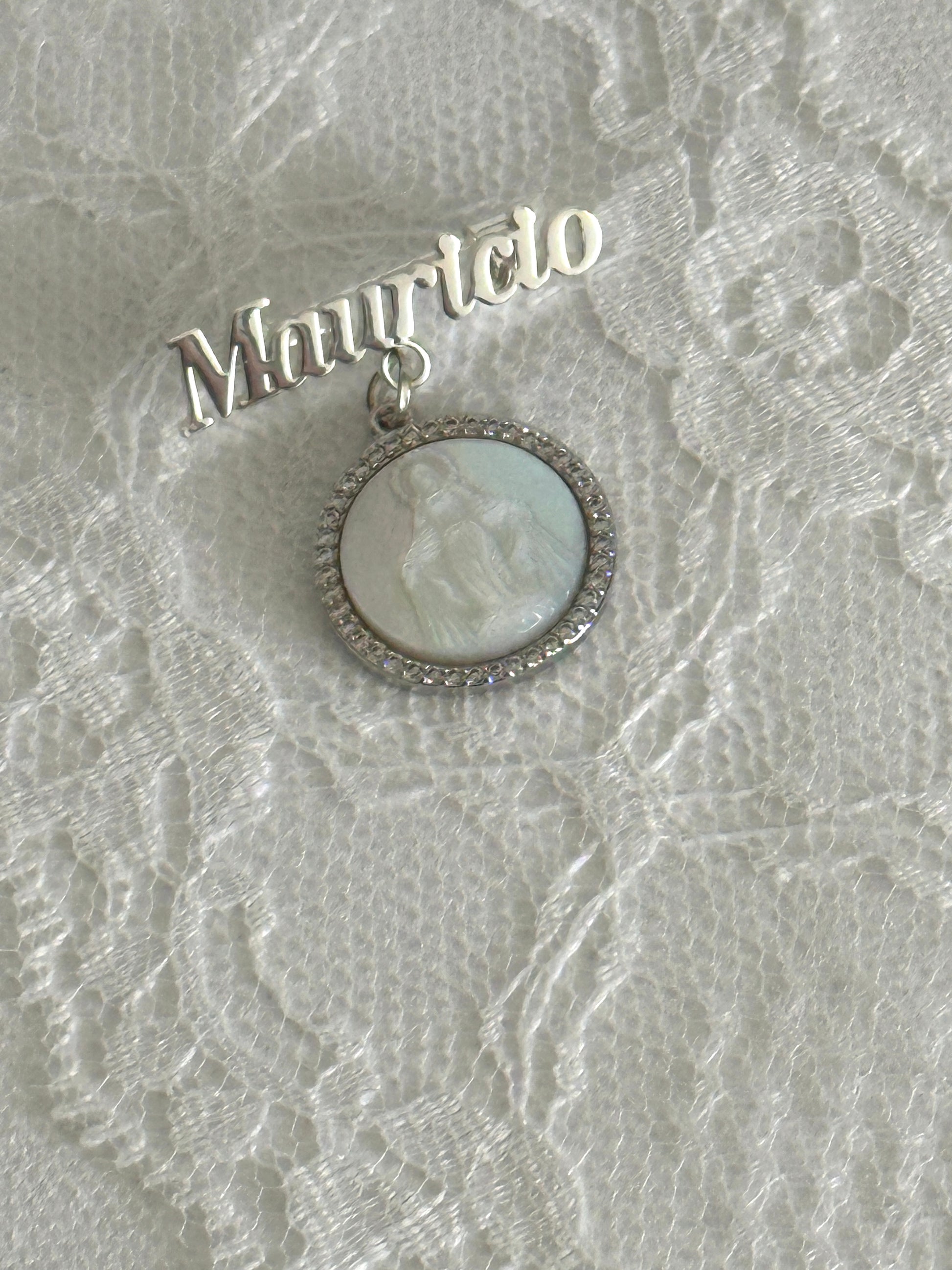 Enhance your style with the personalized "Personalizado Mauricio" necklace. Features a customized nameplate with a genuine mother of pearl medallion and sparkling zirconia accents on the Virgin Mary. Perfect for expressing your faith and individuality.