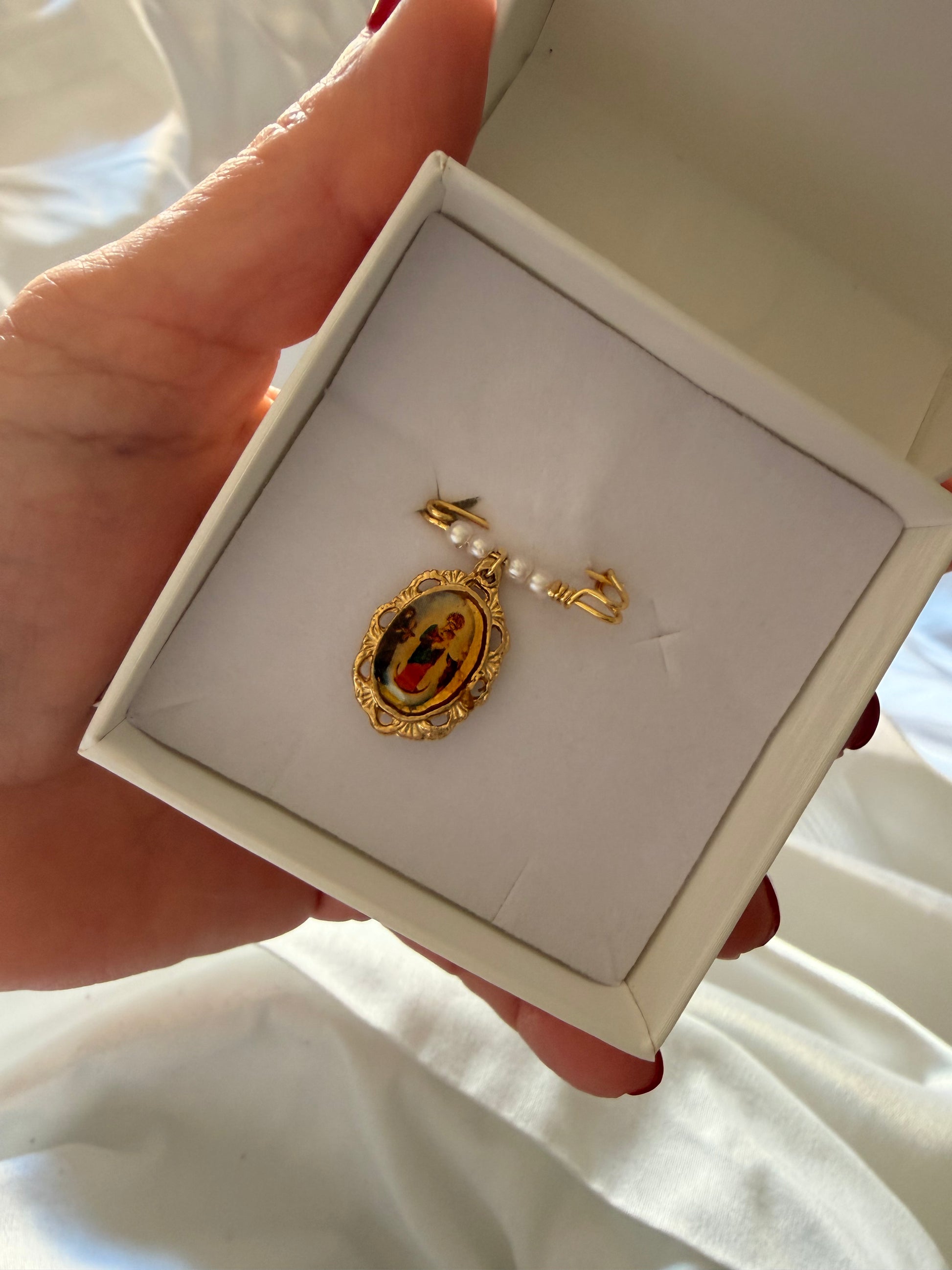 Expertly handcrafted, these Pin perlas de la Chinita feature a delicate imperdible design with beautiful perlitas, showcasing the Medalla de la Virgen de la Chiquinquira. Elevate any outfit with this exquisite piece of religious jewelry.