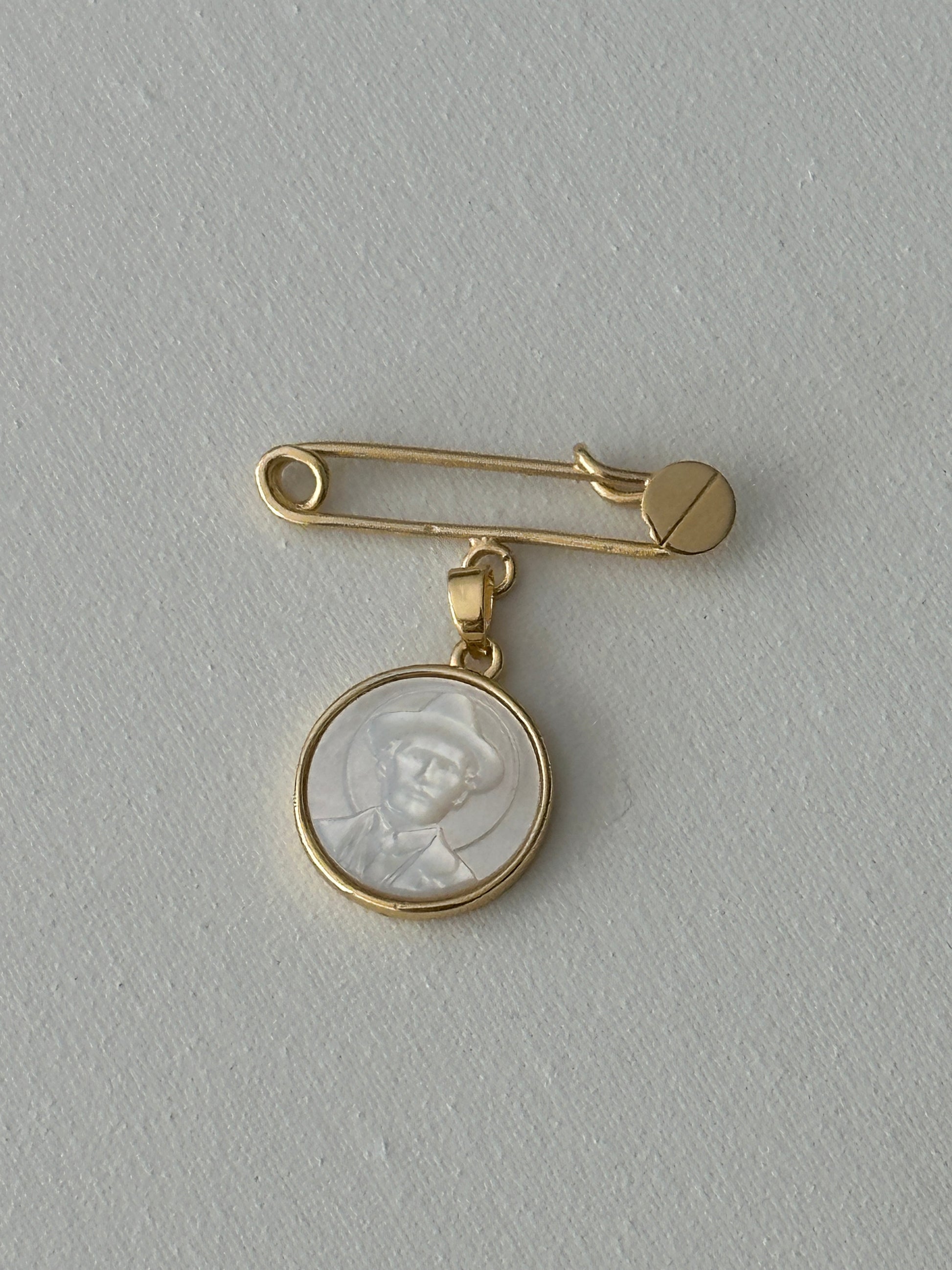 Enhance your style with our Pin San Jose Gregorio. This pendant features a beautiful depiction of San Jose Gregorio Hernandez on a mother-of-pearl base with a smooth golden border. Show off your faith with this stunning piece.
